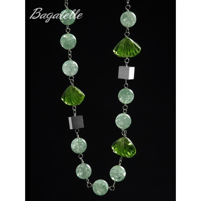 Połączono kule z kryształu lodowego o średnicy 1,6 cm zabarwionego na bladozielony kolor z ciemnozielonymi elementami ze szkła weneckiego i dwoma srebrnymi kostkami o wymiarach 1,2 cm x 1,2 cm.Całość łączona srebrnym łańcuszkiem