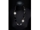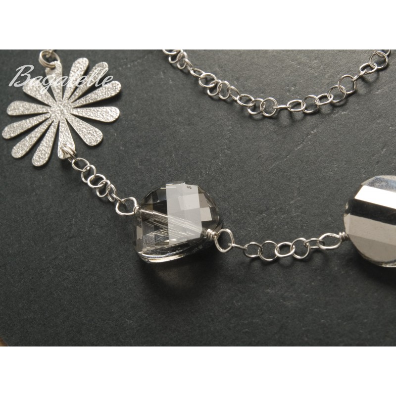 Naszyjnik wykonany z czarnego szlifowanego onyksu o wymiarach 2,5 cm x 1,75 cm.Onyks połączono ze szkłem szlifowanym przyciemnianym o średnicy 1,8 cm oraz kwiatkami ze srebra o średnicy 2,95 cm.Całość na srebrnym łańcuszku